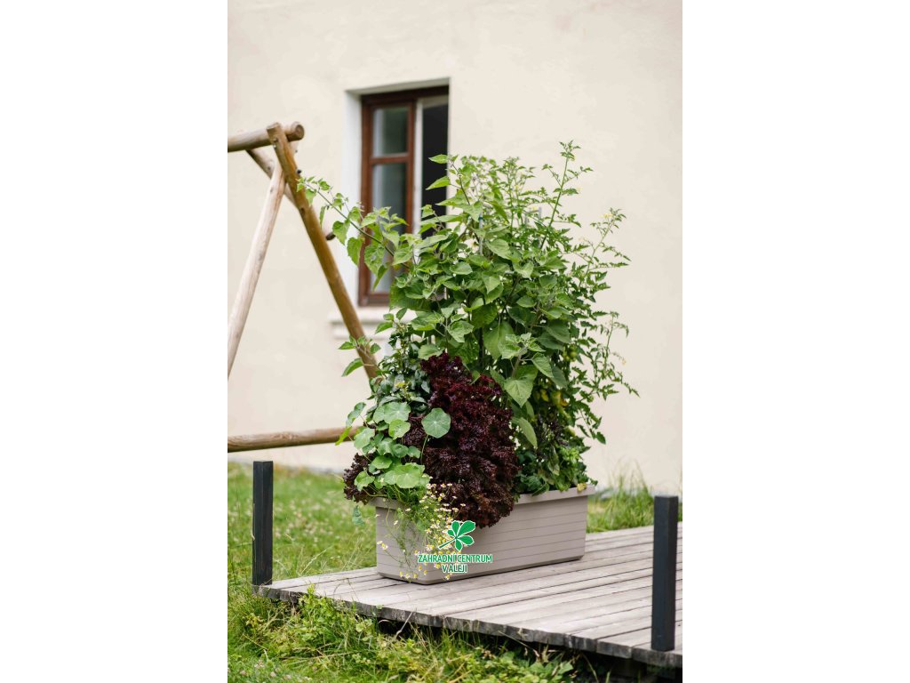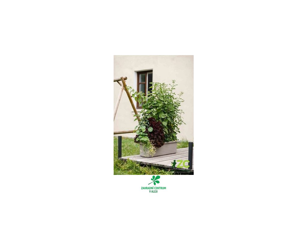 Velkoobjemový samozavlažovací truhlík v novém designu. Uvnitř jsou tři samostatné nádoby, každá s otvorem pro pevné uchycení opory pro rostliny.