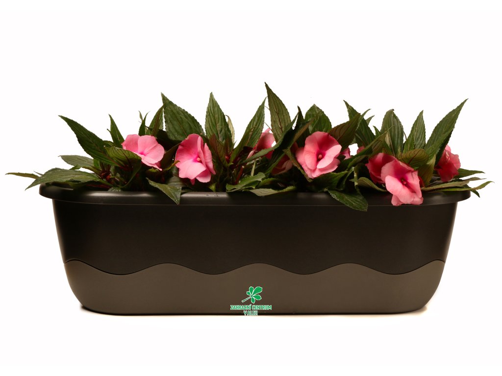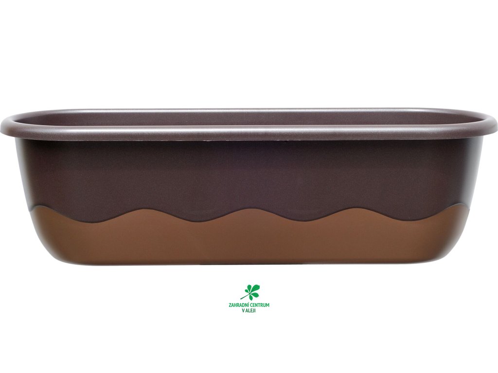 Samozavlažovací truhlík Mareta 60 cm v barevné kombinaci čokoládová a bronzová. Obsahuje hladinoměr, zalévací šachtu, knot a sponu.