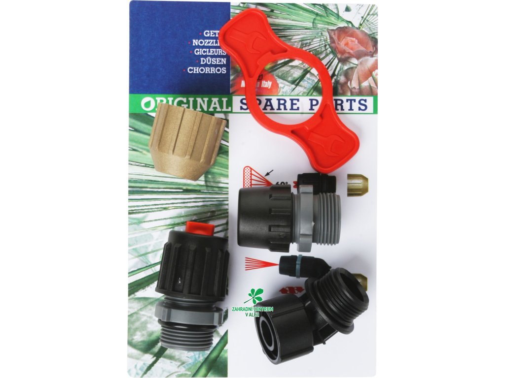 Sada obsahuje kruhovou trysku standard, trysku s přímou štěrbinou, díl pro připojení trysky pod úhlem 45° a klíč k výměně trysek.